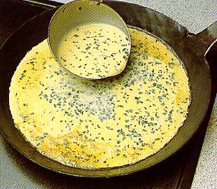 | Die Butter in einer sehr qroßen oder zwei mittelgroßen Pfannen aufschäumen. Die Eiermasse hineingießen, ganz kurz stocken lassen. | ![]() |
